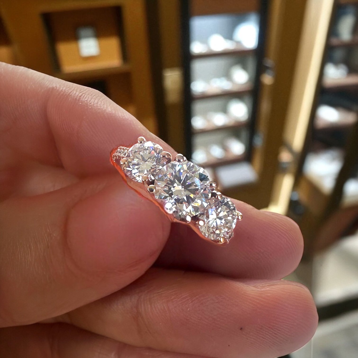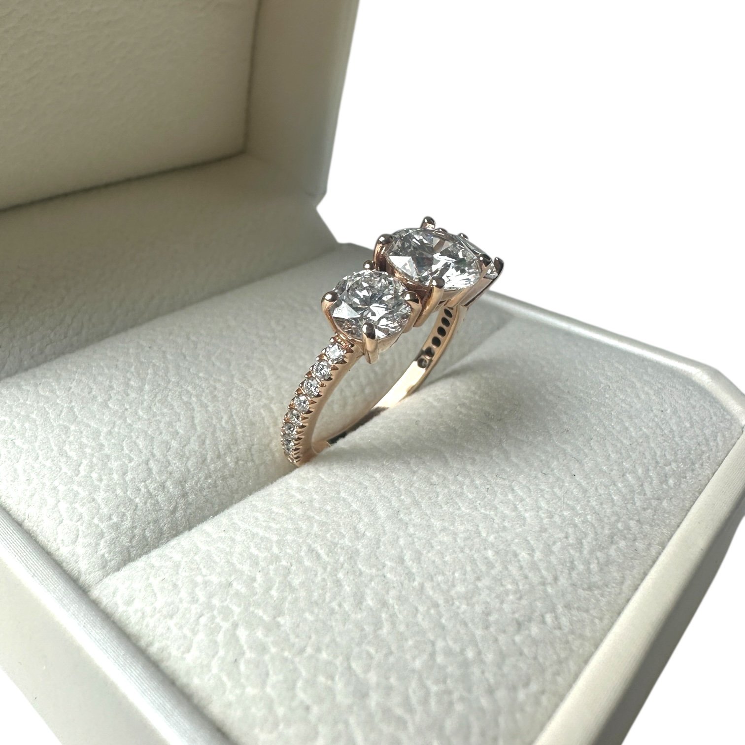 Fabricado en oro rosado sólido 18K, este anillo combina la suavidad cálida del oro con el brillo impecable de los diamantes de laboratorio, seleccionados por su claridad, pureza y destello excepcional. La piedra central —impactante y refinada— se complementa con dos diamantes laterales que celebran el pasado, el presente y el futuro; un simbolismo clásico en las joyas de compromiso de lujo.