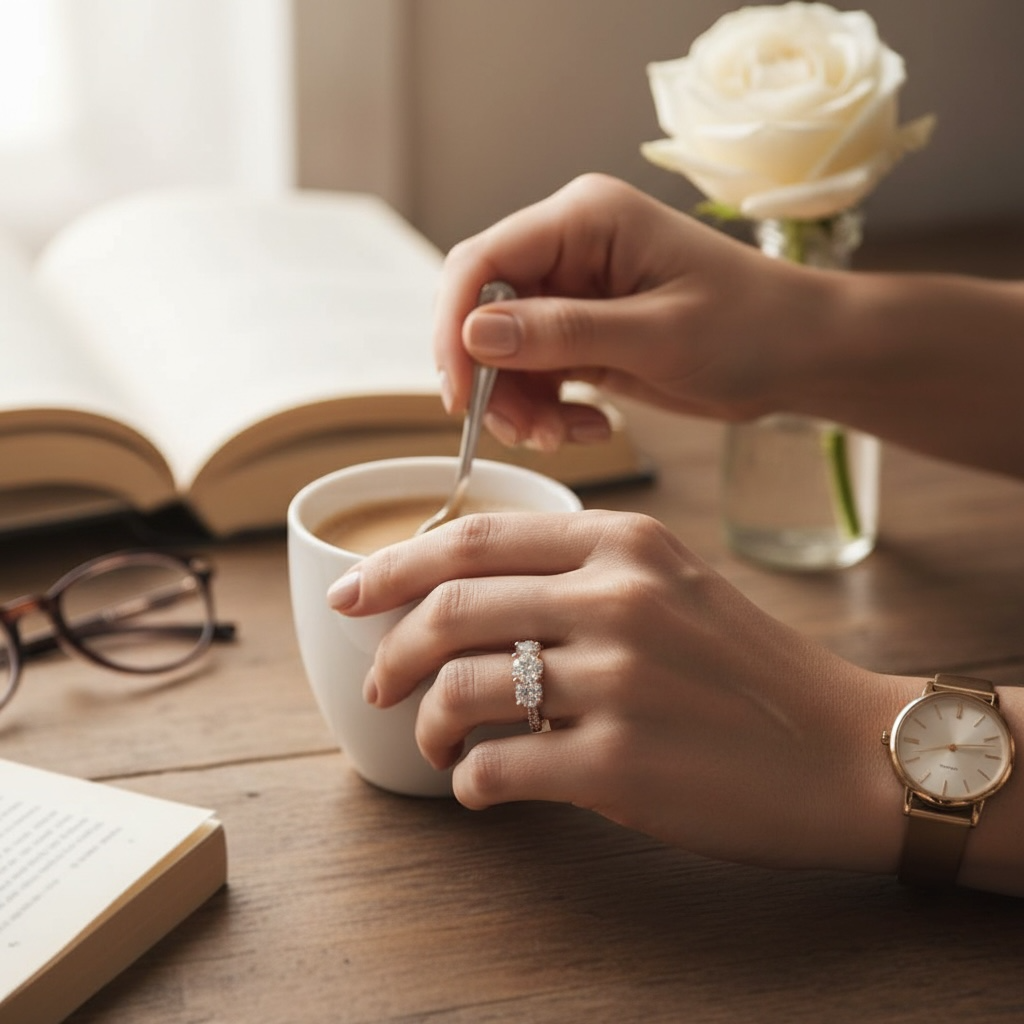 El pavé sobre el aro añade un toque de elegancia fina, asegurando que cada movimiento de la mano revele un juego de luz que enamora. Su diseño balanceado lo hace perfecto tanto para una propuesta de matrimonio, como para celebrar un logro personal, un renacimiento o un momento inolvidable.