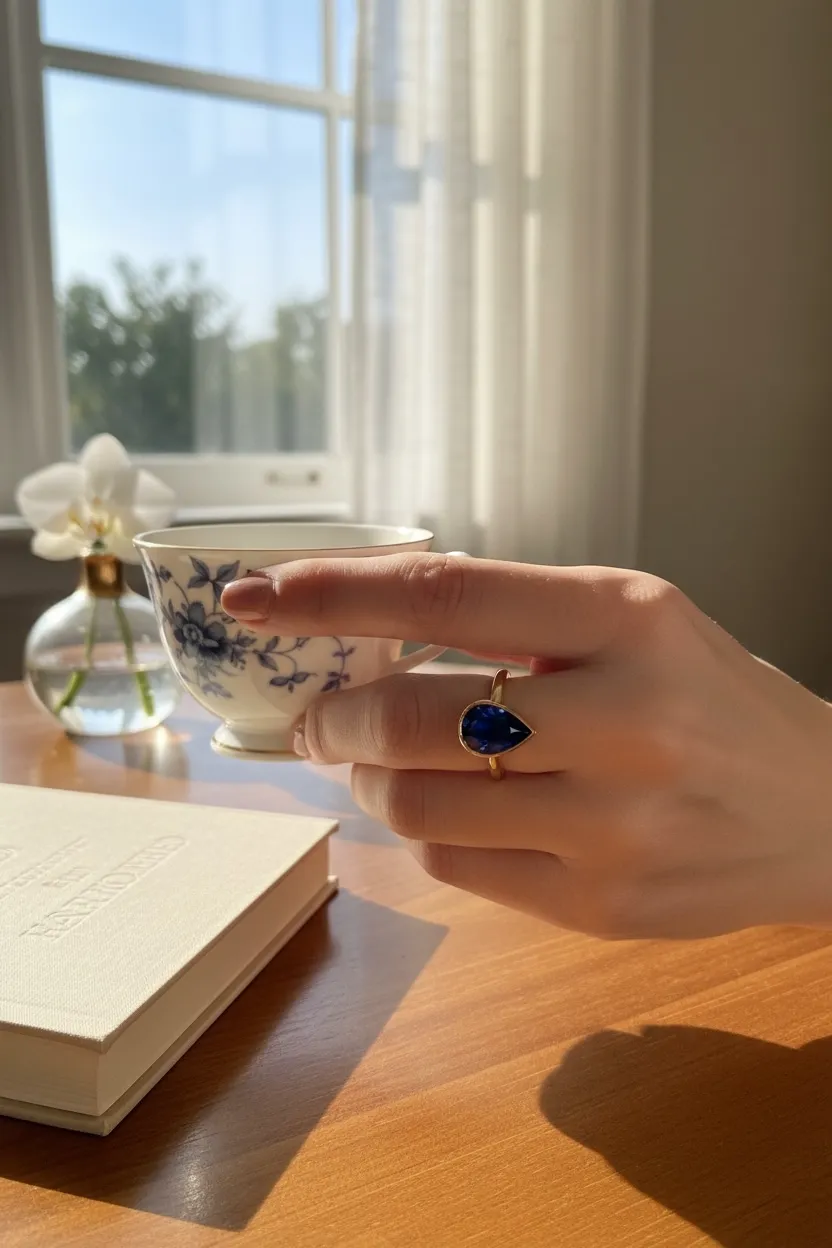 Su piedra azul profundo, corte pera, refleja serenidad, confianza y claridad. No es un color que grita… es un color que impone respeto.