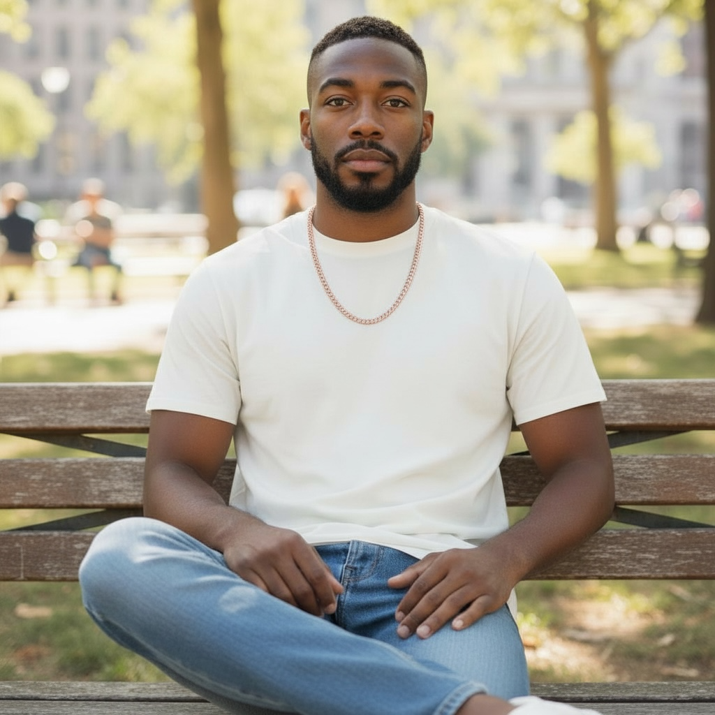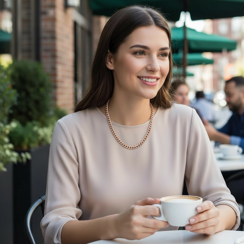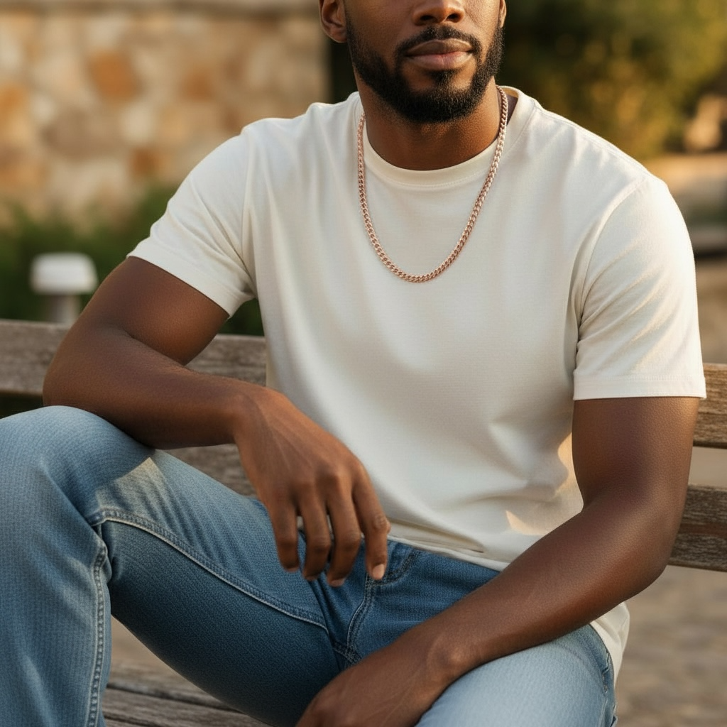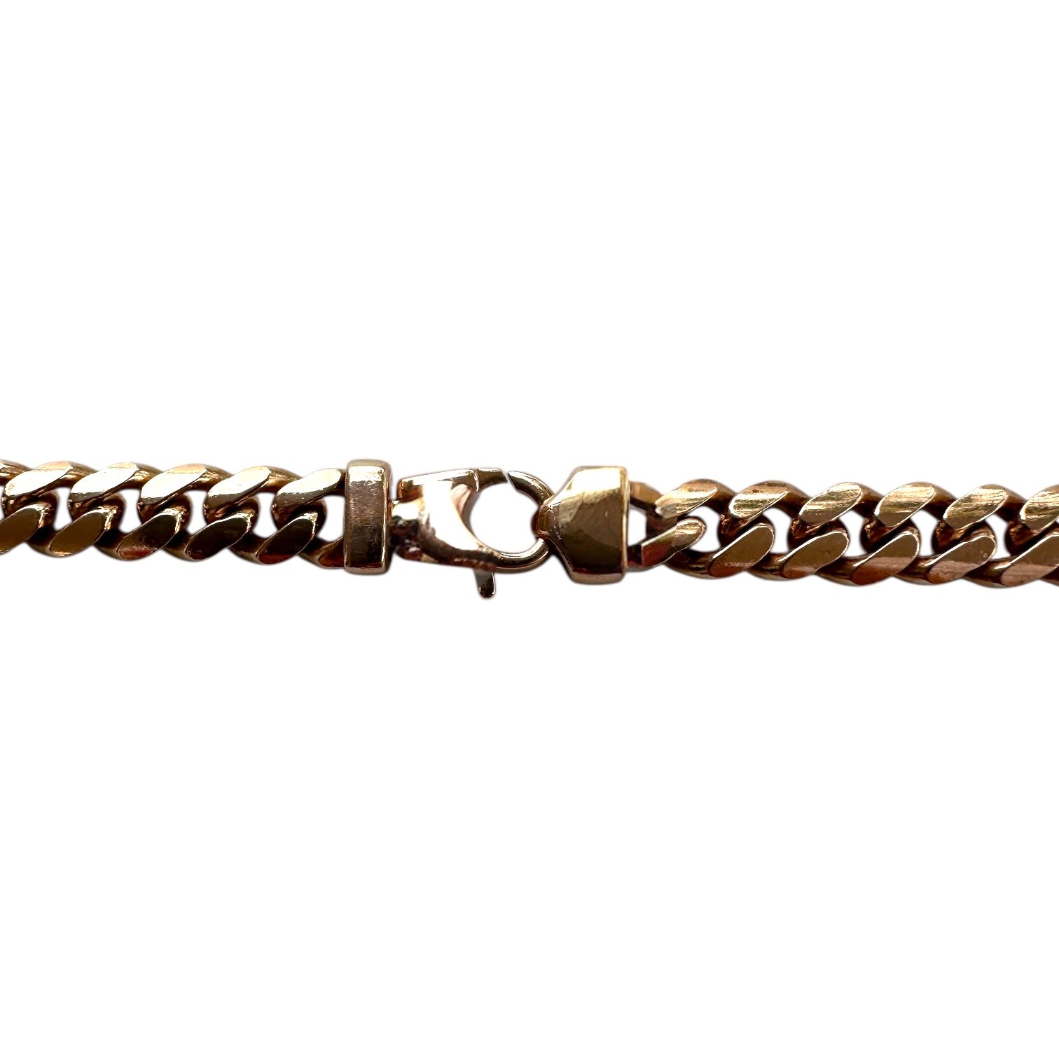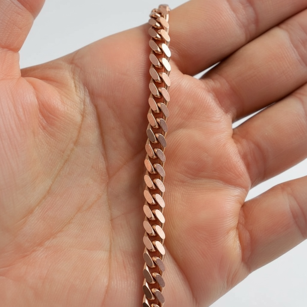 Fabricada en oro rosado sólido 14K, esta cadena combina la fuerza característica del eslabón cubano con la calidez moderna del oro rosado. Cada eslabón ha sido pulido con precisión para crear un movimiento uniforme y un acabado espejo que ilumina el cuello con elegancia atemporal.