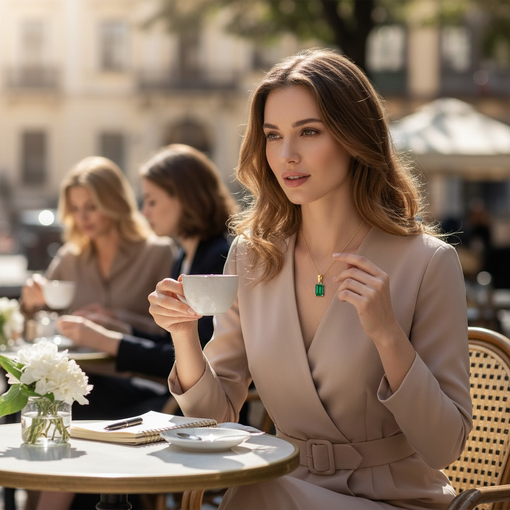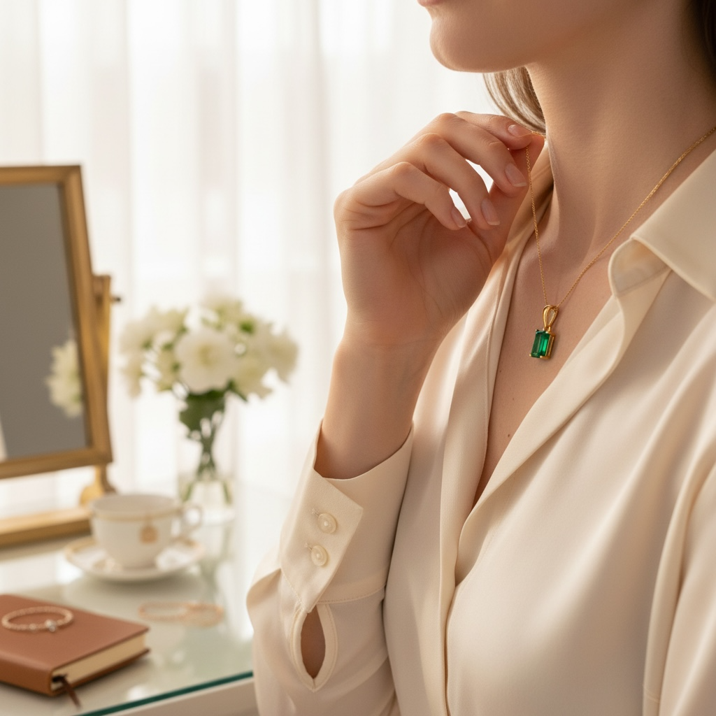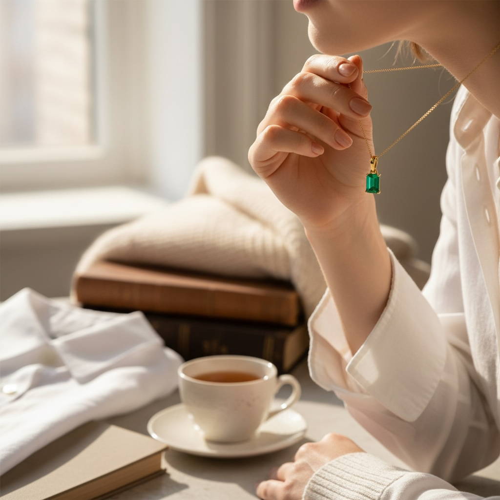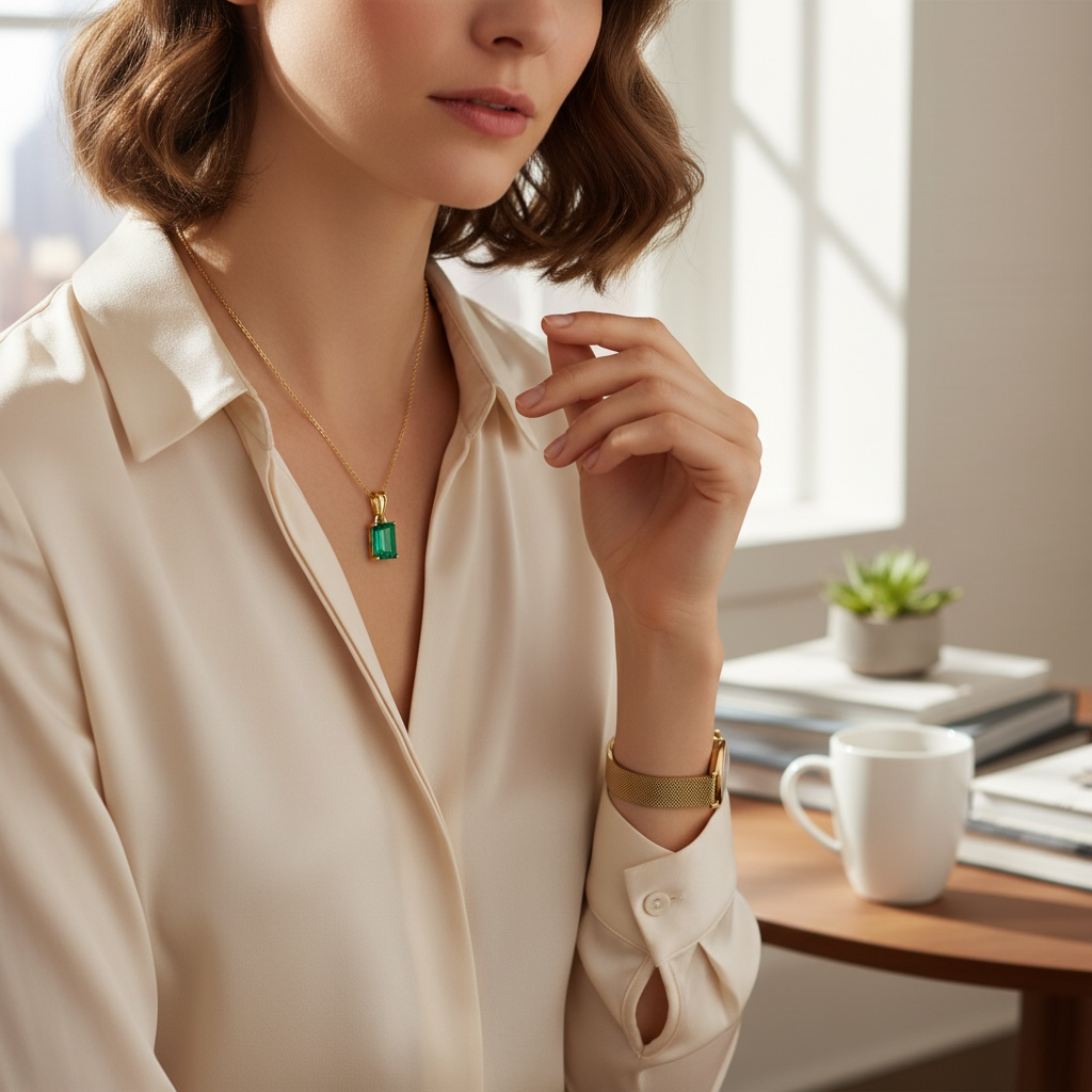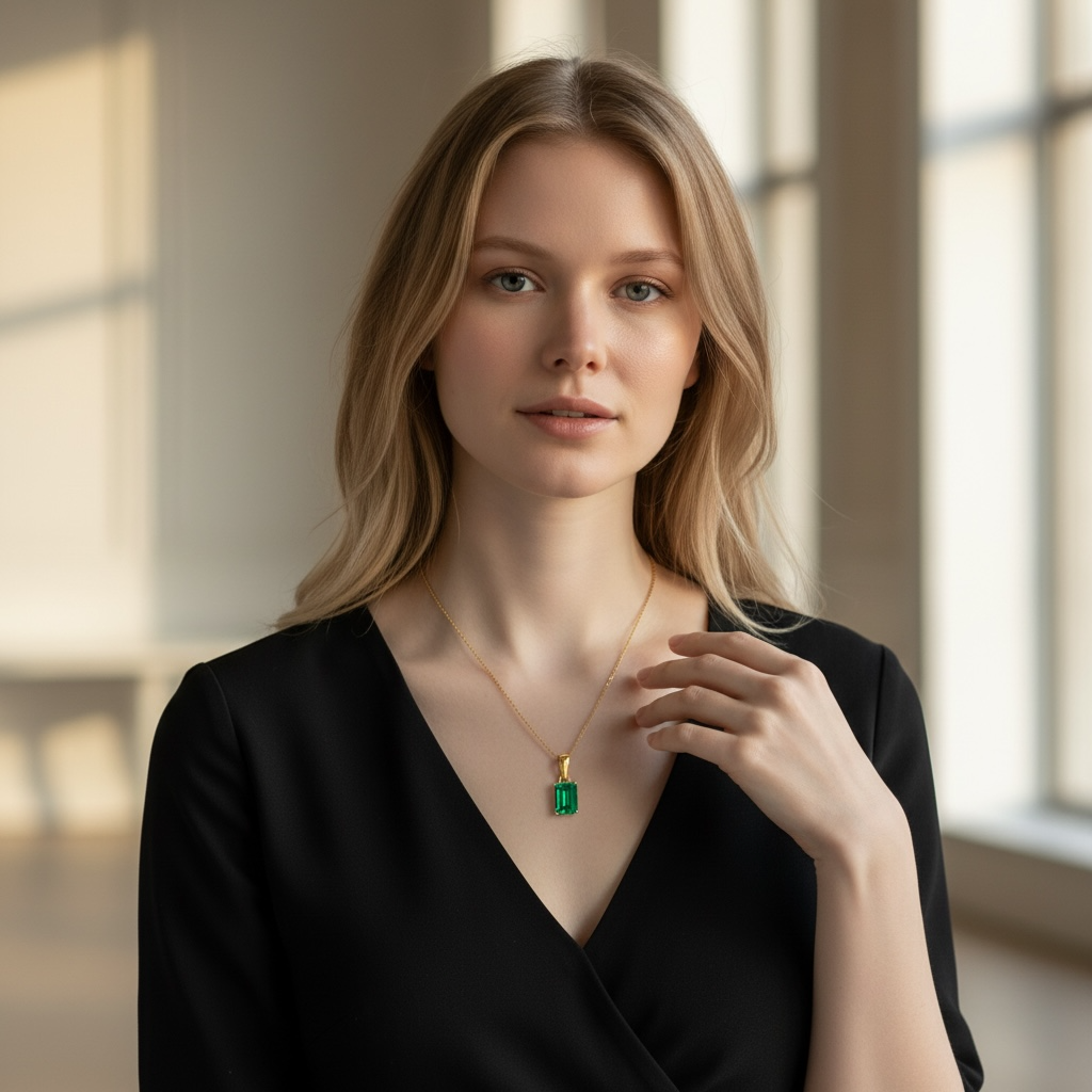 El Dije Esmeralda Lab Oro 18K es una pieza que representa renovación, equilibrio y crecimiento interior. Su diseño minimalista permite que la belleza de la piedra sea la verdadera protagonista.