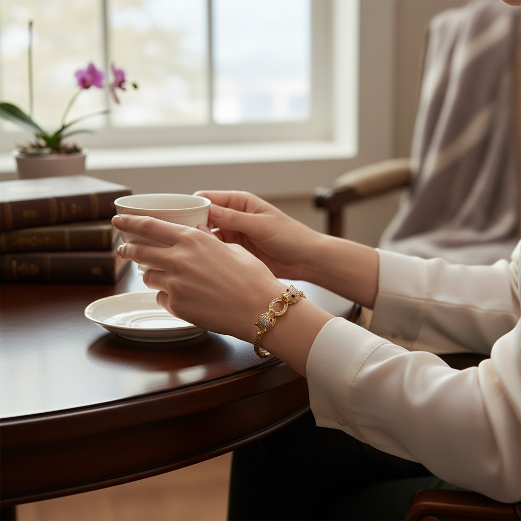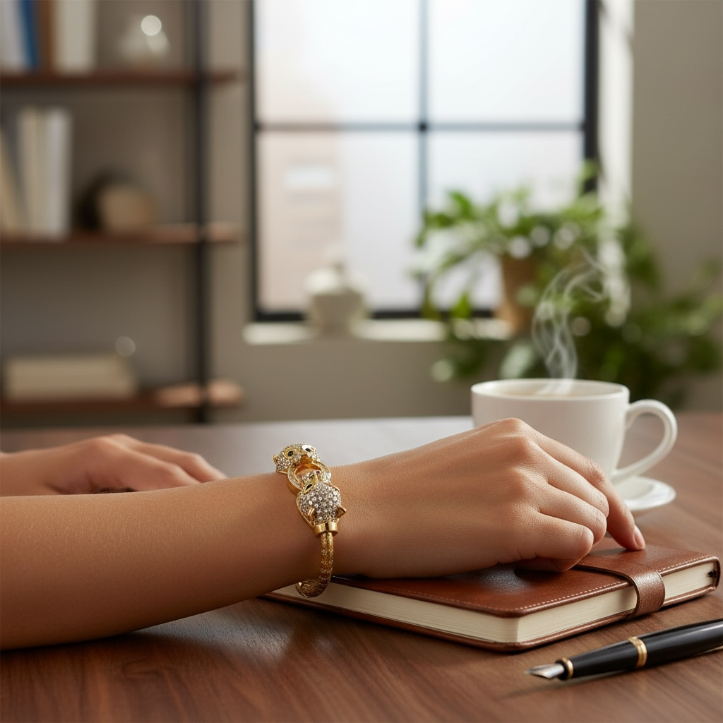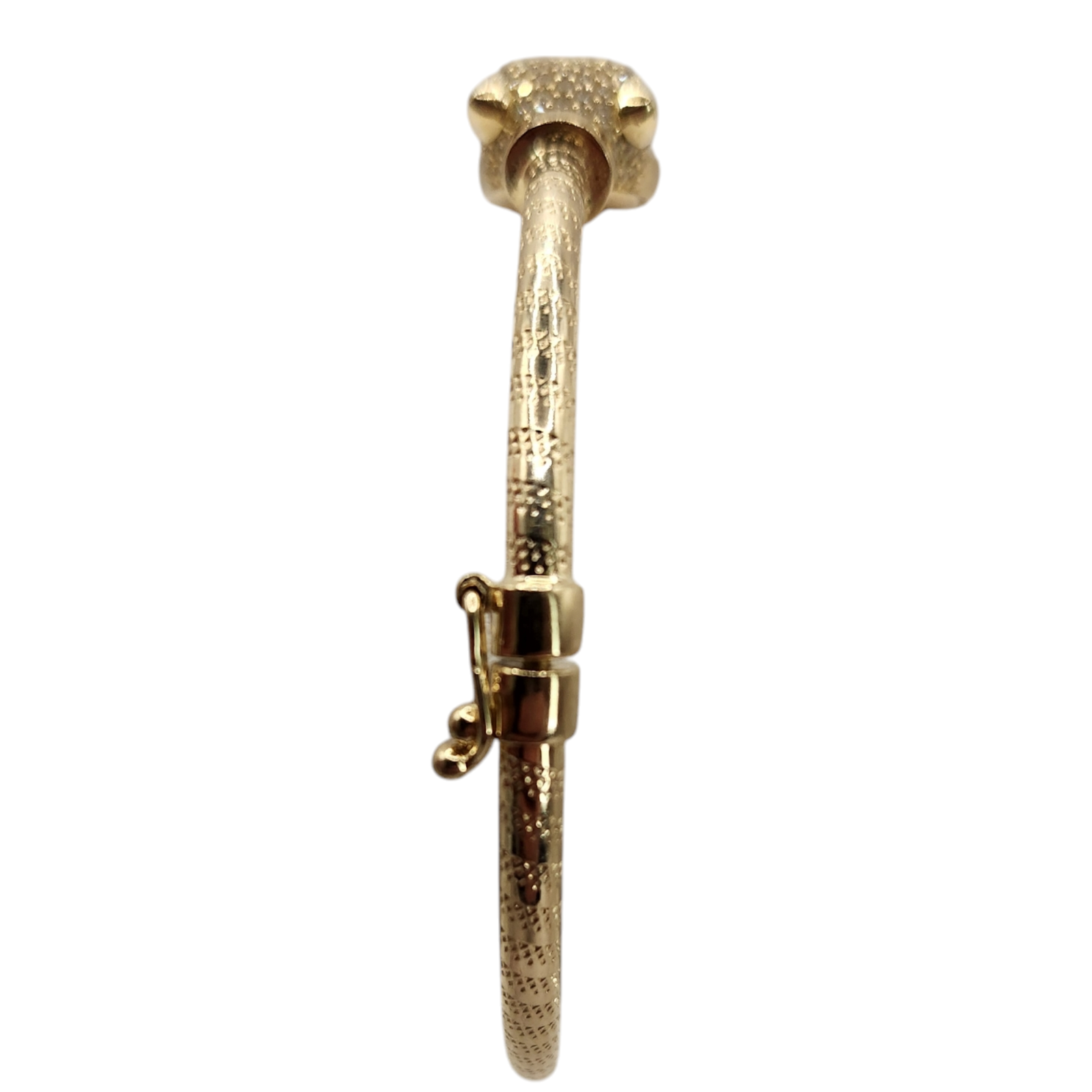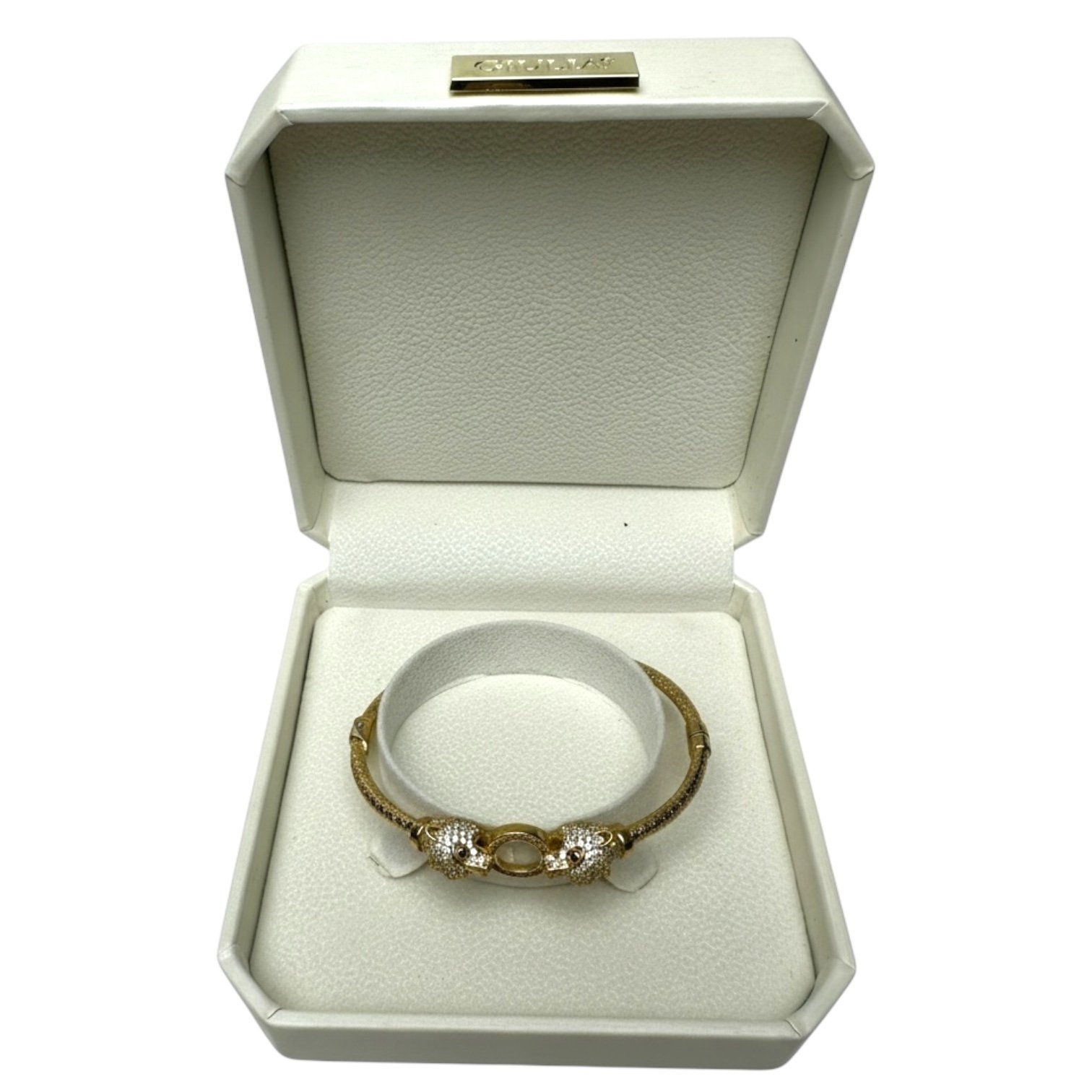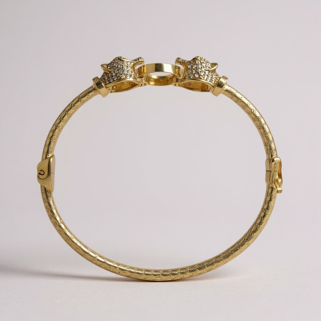 Fabricada en oro 10K, esta pulsera combina durabilidad con un brillo dorado intenso que realza todos los detalles de su estructura. Las cabezas de pantera, minuciosamente trabajadas, están cubiertas con destellos pavé en circonias de alto brillo, que aportan luz y protagonismo a la pieza. Los ojos contrastan con un enfoque penetrante, logrando ese efecto icónico de las joyas felinas de lujo.